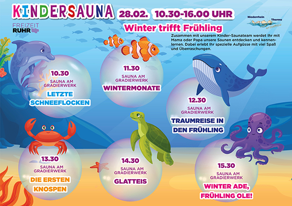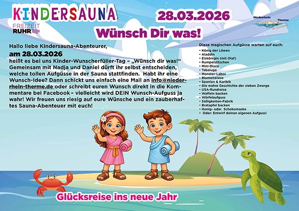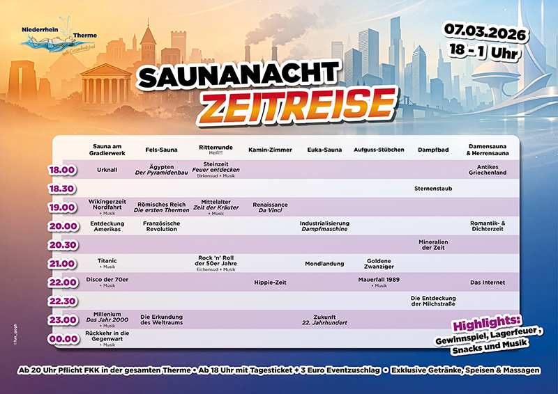 Entdecke unsere beliebten Sauna-Highlights wie Romantik-Nacht oder unsere abwechselnden Sauna-Mottotage! Auch die Kindersaunatermine bieten viel Spaß 💦