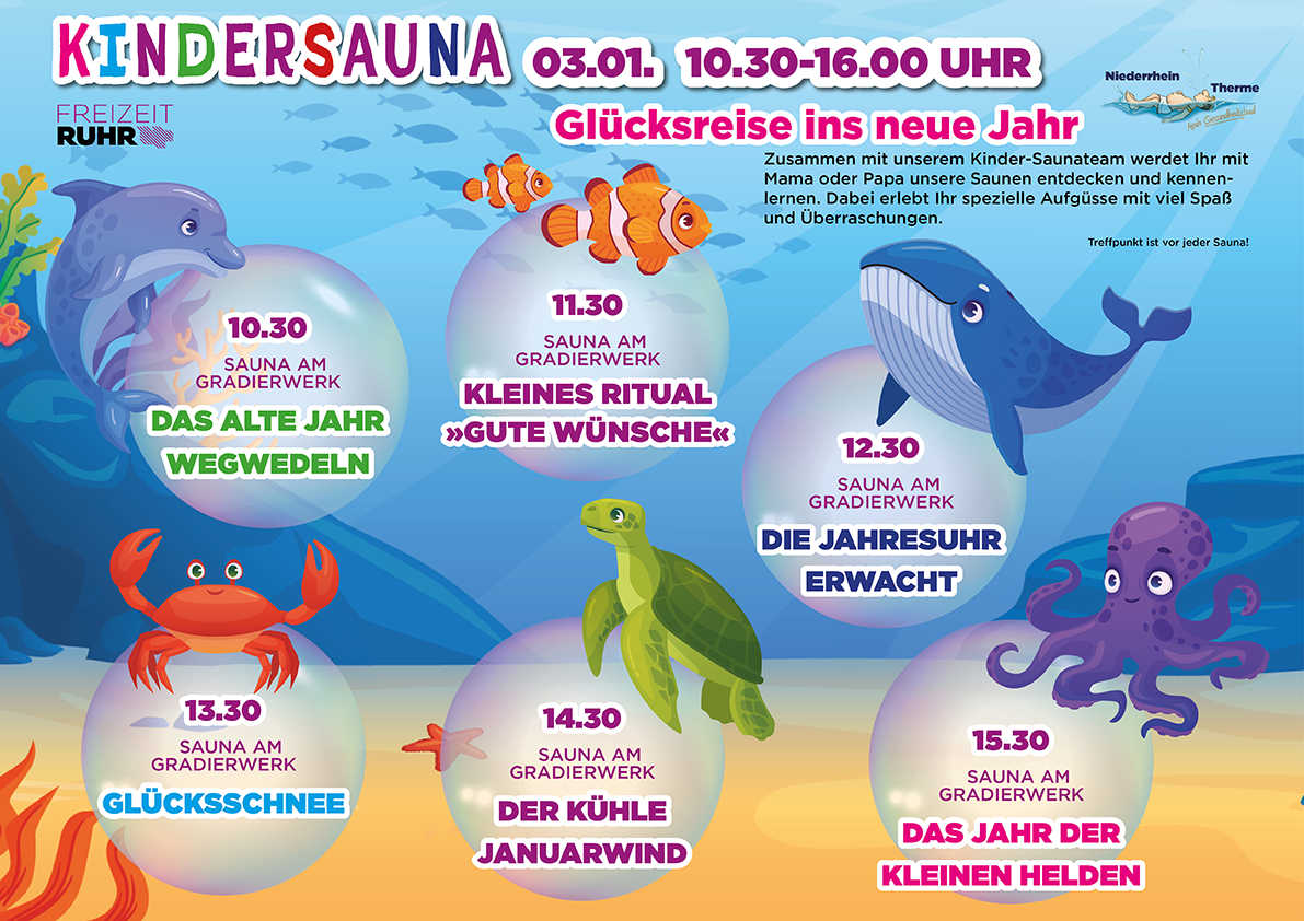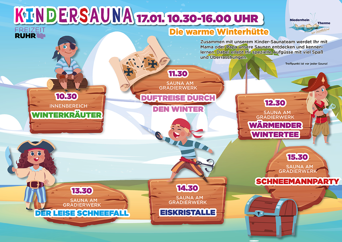 Abwechslungsreich und mit viel Spaß wirst Du mit Deinem Kind das Thema Sauna neu erleben und entdecken. Lasst Euch von der Kreativität und jeder Menge guter Laune anstecken und genießt völlig unbeschwert wertvolle freie Zeit miteinander. Wir freuen uns auf Euch!