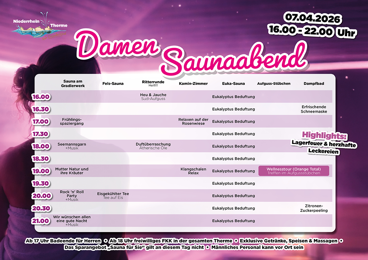 Willkommen zu einer weiteren Ladies Night in der Niederrhein-Therme. Showacts in der Sauna, ein ganz besonderes Aufgussprogramm mit Peelings und Klangschalen, frische Meeresluft in der Salzgrotte, Aqua-Fitness in der Welle … und noch viel mehr erwartet alle Damen bei diesem Event. Massagen zum Schnupperpreis werden ebenfalls angeboten und in der Gastro könnt Ihr lecker schlemmen – nicht im Preis enthalten. Genießt das volle Verwöhnprogramm.