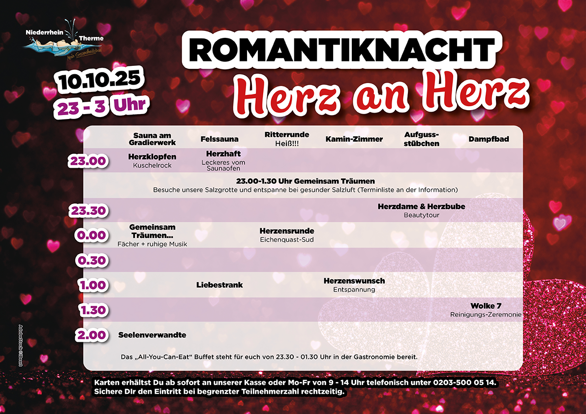 An besonderen Terminen veranstalten wir unter dem Motto „Herz an Herz“ von 23.00 bis 3.00 Uhr unsere beliebten Romantiknächte: In zauberhaftem Ambiente und mit romantischen Highlights, inklusive Schlemmerbuffet. Unbedingt zeitig anmelden!