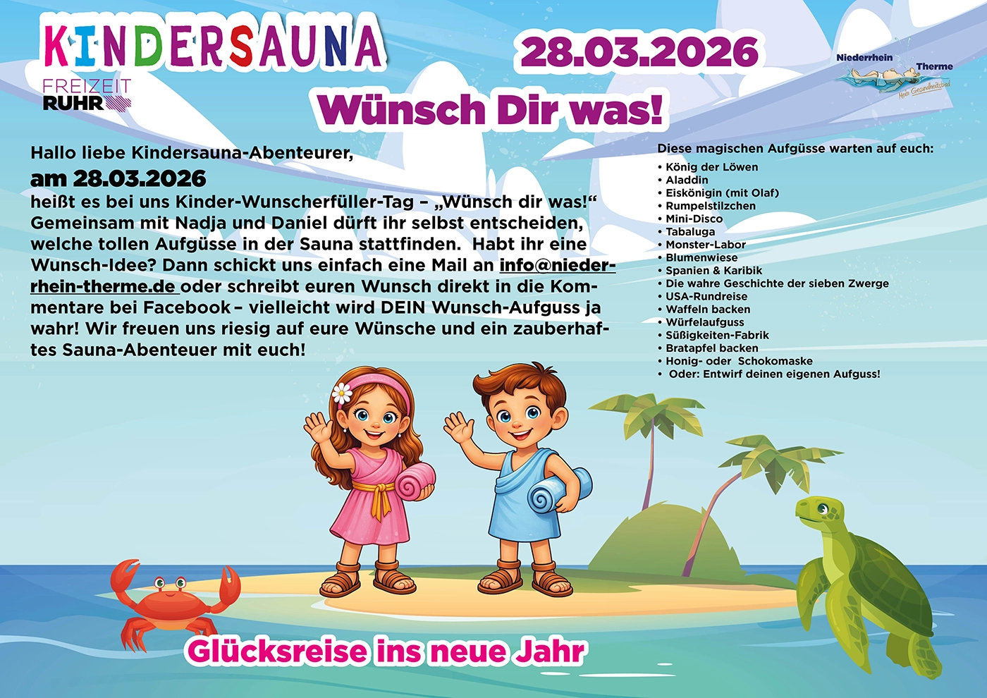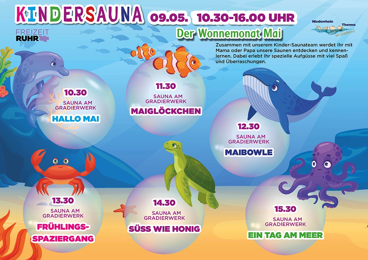 Abwechslungsreich und mit viel Spaß wirst Du mit Deinem Kind das Thema Sauna neu erleben und entdecken. Lasst Euch von der Kreativität und jeder Menge guter Laune anstecken und genießt völlig unbeschwert wertvolle freie Zeit miteinander. Wir freuen uns auf Euch!