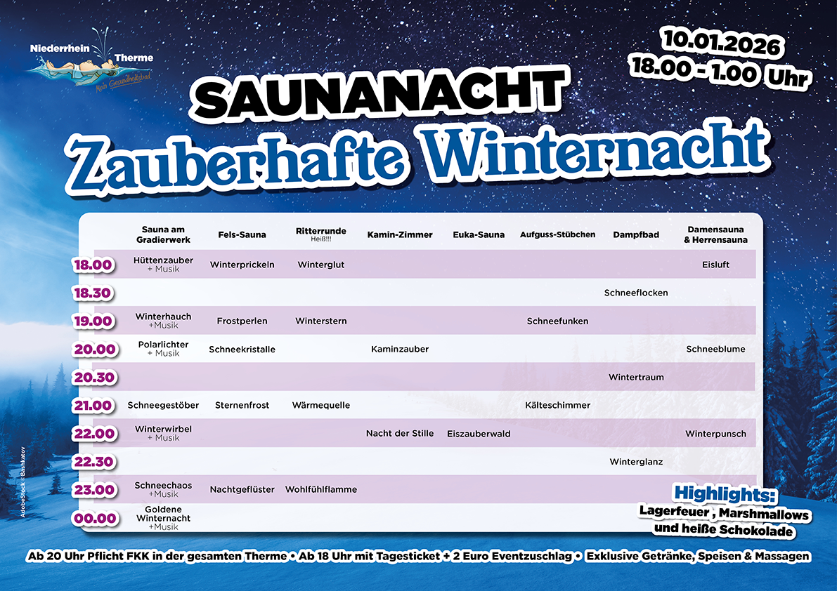 Oft finden mehrere Saunaevents am selben Tag statt: ​​​morgens finden immer im Wechsel die Aufgüsse statt und nur jeweils eine Sauna für Eltern und Kinder wird belegt. Unterdessen kannst Du weiterhin ungestört saunieren und findest immer ein Alternativprogramm. Abends steht das Aufgussprogramm dann unter einem bestimmten Motto (siehe oben) – dann gibt es Eventaufgüsse, die es an einem normalen Samstag nicht gibt und wir haben eine Stunde länger geöffnet. Wir bieten also mehr Programm und Abwechslung als an einem normalen Tag!!!