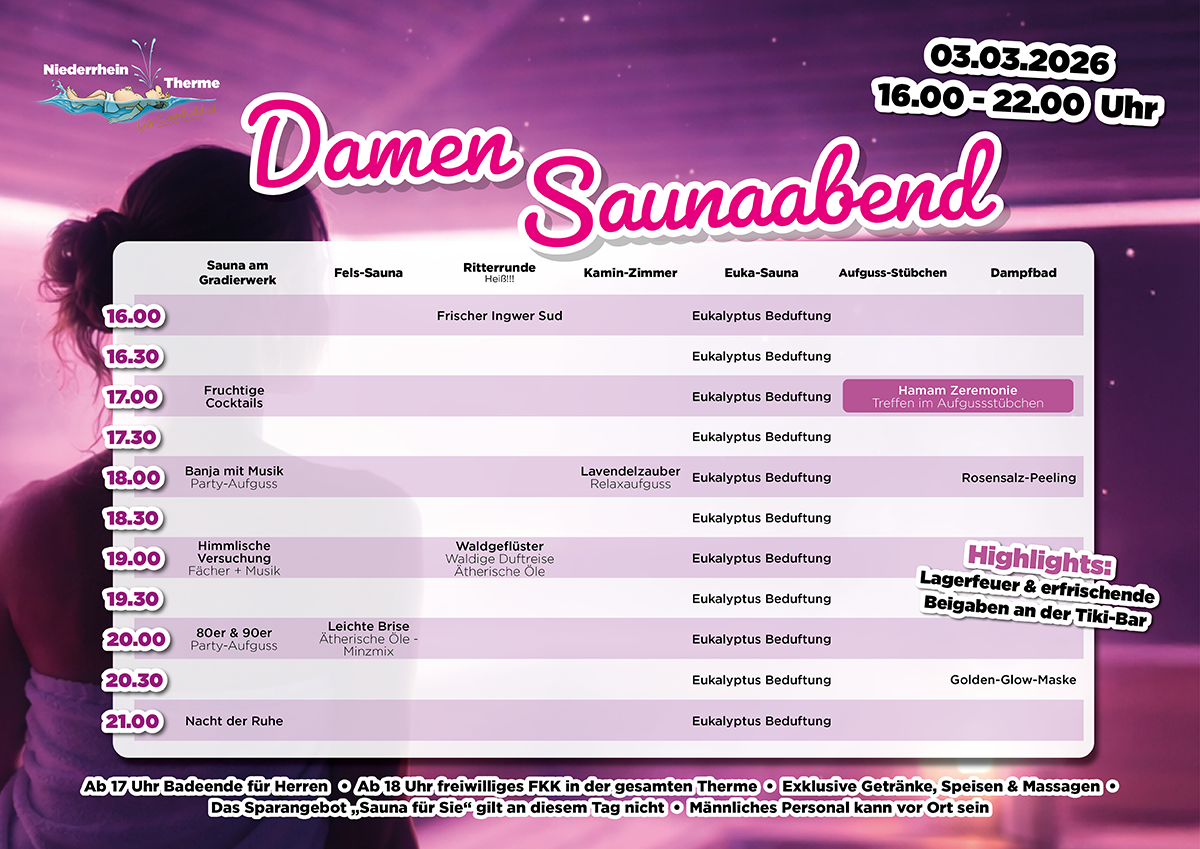 Willkommen zu einer weiteren Ladies Night in der Niederrhein-Therme. Showacts in der Sauna, ein ganz besonderes Aufgussprogramm mit Peelings und Klangschalen, frische Meeresluft in der Salzgrotte, Aqua-Fitness in der Welle … und noch viel mehr erwartet alle Damen bei diesem Event. Massagen zum Schnupperpreis werden ebenfalls angeboten und in der Gastro könnt Ihr lecker schlemmen – nicht im Preis enthalten. Genießt das volle Verwöhnprogramm.