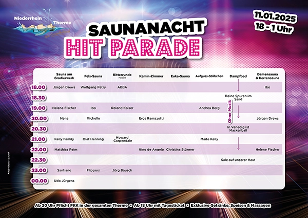 Entdecke unsere beliebten Sauna-Highlights wie Romantik-Nacht oder unsere abwechselnden Sauna-Mottotage! Auch die Kindersaunatermine bieten viel Spaß 💦