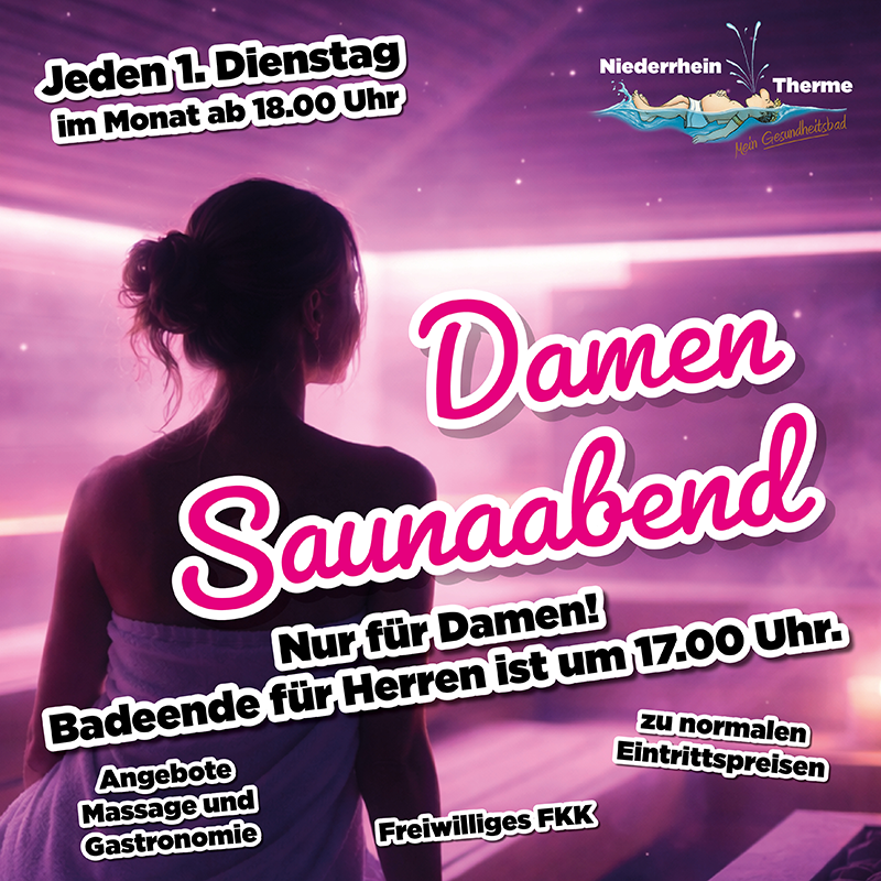 Zeit nur für Dich. Zeit nur für Frauen. Ab März öffnen wir jeden ersten Dienstag im Monat ab 18.00 Uhr unsere Therme exklusiv für weibliche Gäste. Ein regelmäßiger Damen Saunaabend – entspannt, wertschätzend und ganz unter Frauen. Was Dich erwartet: Sauna.Sole. Salzgrotte. Wohlige Wärme, ruhige Atmosphäre und einfach mal durchatmen. Ab 18.00 Uhr gehört die Therme ganz den Damen – zum Saunieren, Entspannen und Abschalten vom Alltag. Um 17.00 Uhr ist an diesen Tagen Badeende für Herren.