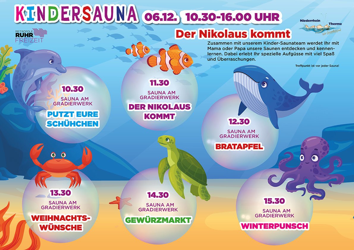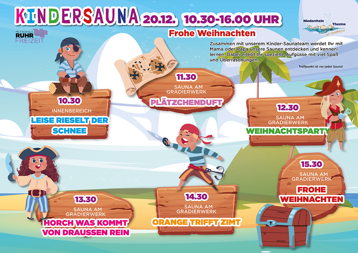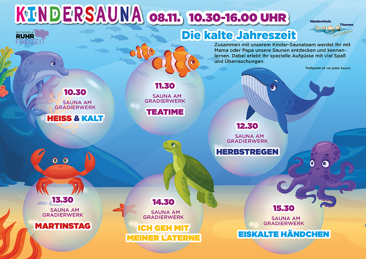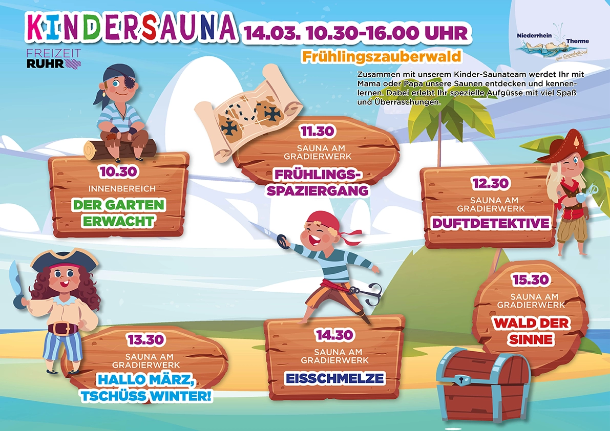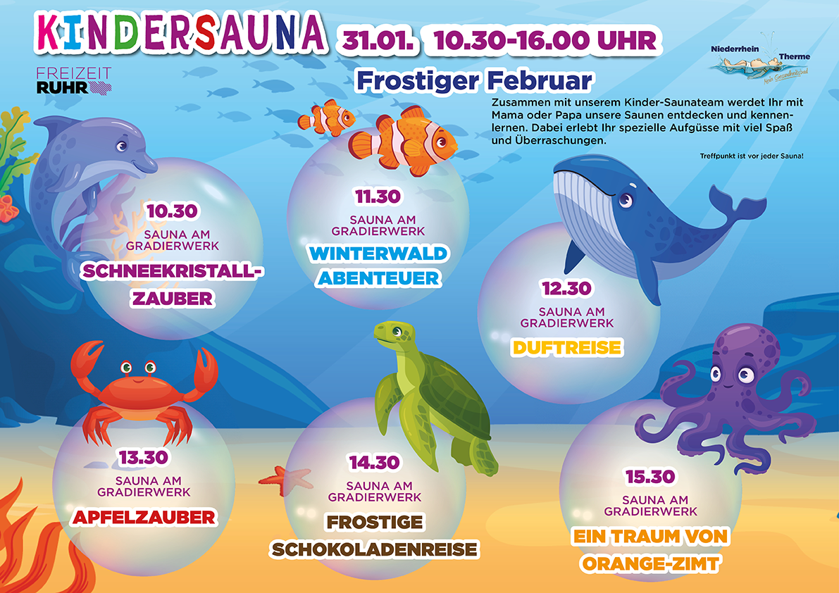 Abwechslungsreich und mit viel Spaß wirst Du mit Deinem Kind das Thema Sauna neu erleben und entdecken. Lasst Euch von der Kreativität und jeder Menge guter Laune anstecken und genießt völlig unbeschwert wertvolle freie Zeit miteinander. Wir freuen uns auf Euch!