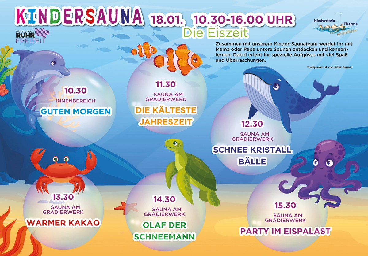 Abwechslungsreich und mit viel Spaß wirst Du mit Deinem Kind das Thema Sauna neu erleben und entdecken. Lasst Euch von der Kreativität und jeder Menge guter Laune anstecken und genießt völlig unbeschwert wertvolle freie Zeit miteinander. Wir freuen uns auf Euch!
