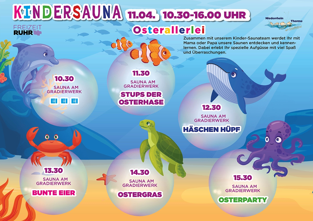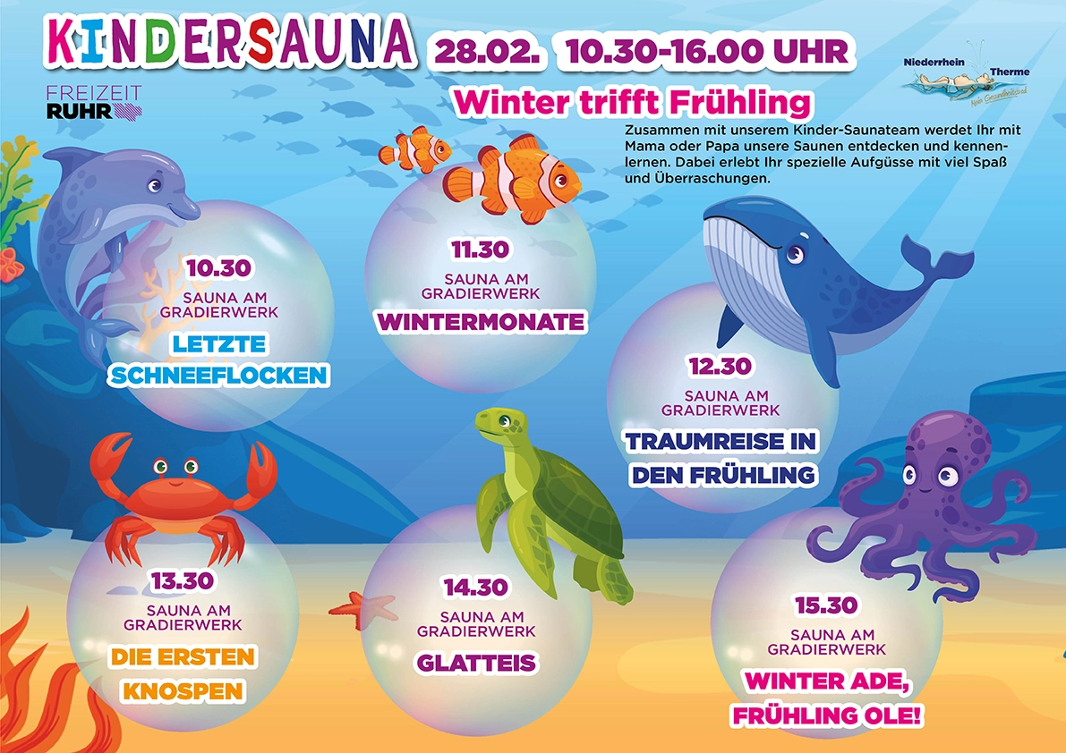 Abwechslungsreich und mit viel Spaß wirst Du mit Deinem Kind das Thema Sauna neu erleben und entdecken. Lasst Euch von der Kreativität und jeder Menge guter Laune anstecken und genießt völlig unbeschwert wertvolle freie Zeit miteinander. Wir freuen uns auf Euch!